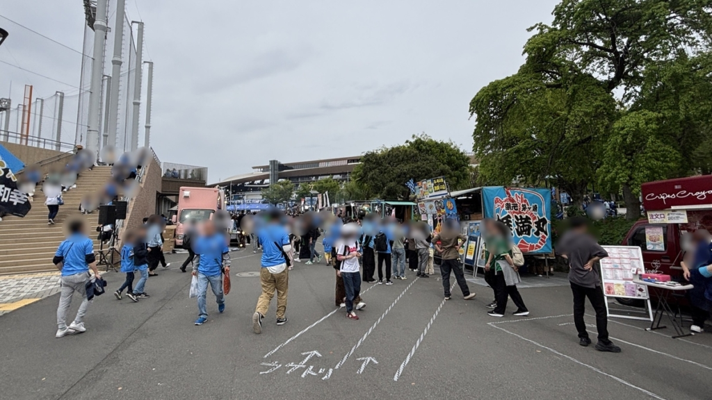 豊富なスタジアムグルメのキッチンカーが並ぶほか、子どもが楽しめるアトラクション、選手とのコラボ企画など、試合開始前からお祭りのような雰囲気を楽しめます。